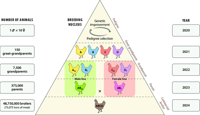 • The pyramid of breeding: commercial broilers are the bottom of a long, structured funnel of pure lines -> Great Grand Parents (GGPs) -> Grand Parents (GPs) -> Parents (PS) -> broilers. Only at the top are the concentrated gene combinations that create fast growth.