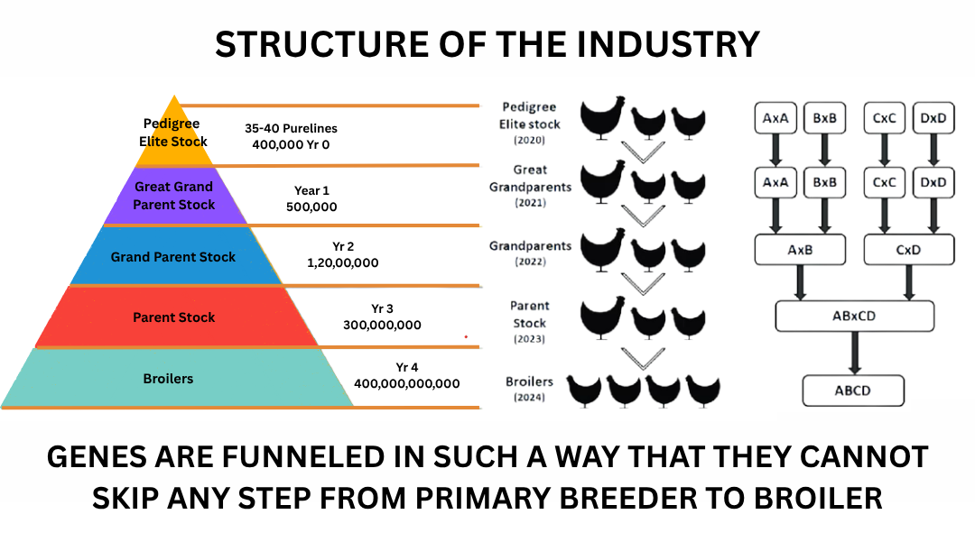 These firms own the primary breeding lines, i.e. the elite, pure genetic “seeds” that flow down through a tightly managed pyramid of great-grandparents, grandparents, parent stock, and finally the broilers raised on farms and sold in markets.