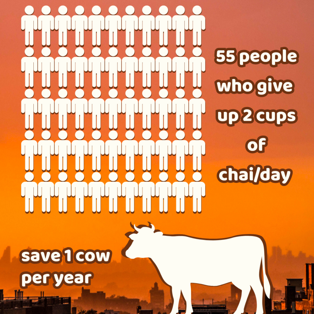 When just 55 people quit two cups of chai per day, we spare one cow from a year of being milked. Remember, this is a conservative figure.